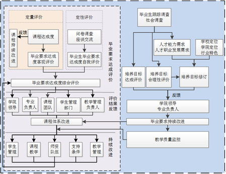 改进模式包括校内(校内的教学过程质量监控)、校外(毕业生及用人单位反馈)两个循环:校内循环主要是对车辆工程专业课程体系的改进,通过适时定性和定量评价毕业要求的达成度,从而不断改进课程体系和课程目标,以实现对毕业要求达成的持续改进。校外循环主要是对车辆工程专业培养目标和毕业要求的改进,通过适时评价培养目标的合理性,调整培养目标以实现培养目标适应社会发展和行业需求。通过评价培养目标的达成情况,调整改进毕业要求,以实现对培养目标达成的改进。学院应建立人才培养目标的合理性评价机制、毕业要求达成度评价机制、课程体系合理性评价机制及课程目标达成度评价机制,进一步规范教学过程评价与持续改进的实施。