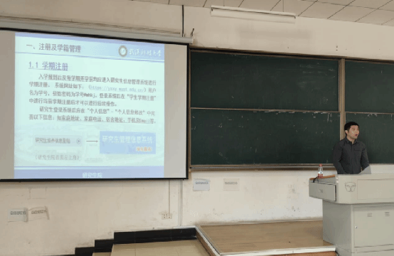 我院研究生教学秘书蒋开胜则对研究生入学后在教学方面的诸多事项展开了详细讲解,他为新生们介绍了研究生信息管理系统以及系统的使用,仔细提醒了新生们在入学后需要进行的操作以及在各个阶段需要注意的事项。