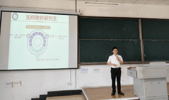 李苑则为研究生新生展开了安全教育讲座,他从日常安全隐患、宿舍安全、防诈骗防传销、心理安全等方面全面具体地强调了生命安全健康的重要性,叮嘱同学们日常中要注意安全隐患,同时要注意自己与同学的身体心理健康,有任何问题第一时间联系辅导员。