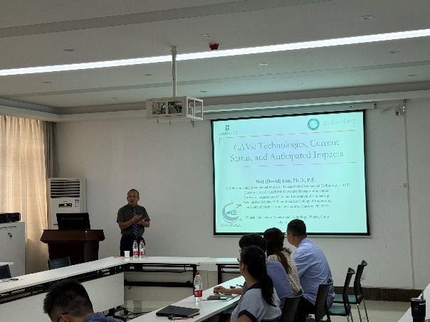 报告题目为“CAVs: Technologies, Current Status, and Impacts”。报告介绍了网联汽车(CV)、自动驾驶汽车(AV)及网联与自动驾驶汽车(CAV)的一般概念和基础知识,用于CV、AV和CAV的技术,CV试点部署计划和AV在美国的现状,以及它们对交通系统,能源消耗和环境的预期影响。听完范围教授的报告,参会师生积极参与了讨论和交流。会后,范围教授与我院交通工程系的老师们进行了深入交流,围绕老师们的研究方向和课题进行了探讨,并提出宝贵意见。