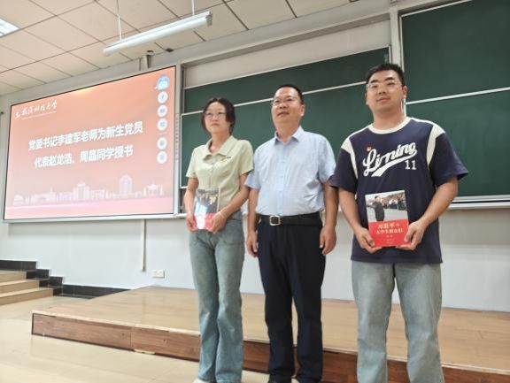 典礼在庄严的国歌声中拉开序幕,李建军为2024级研究生党员代表赵龙浩、周晶授书,鼓励学生党员在未来的学习中,发扬先锋模范作用,秉持不怕苦、爱钻研的精神。