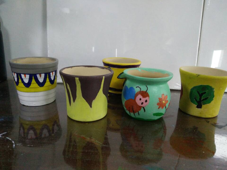 本色陶盆亟待涂色上彩,老师们讨论、构思心中图案和陶盆形状的匹配度。
