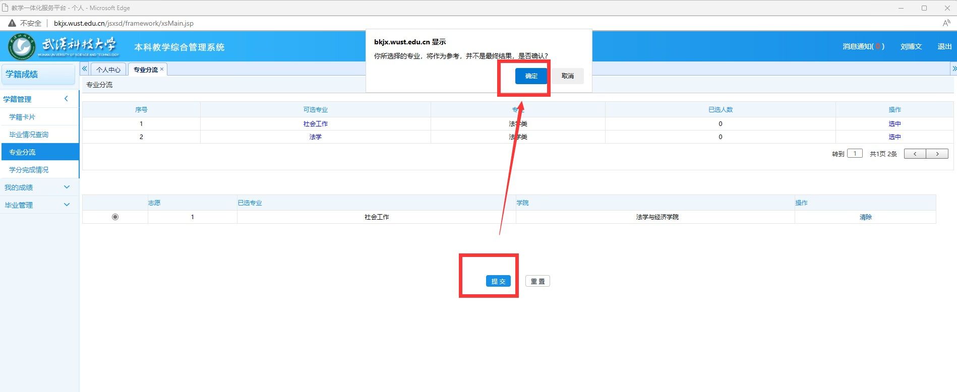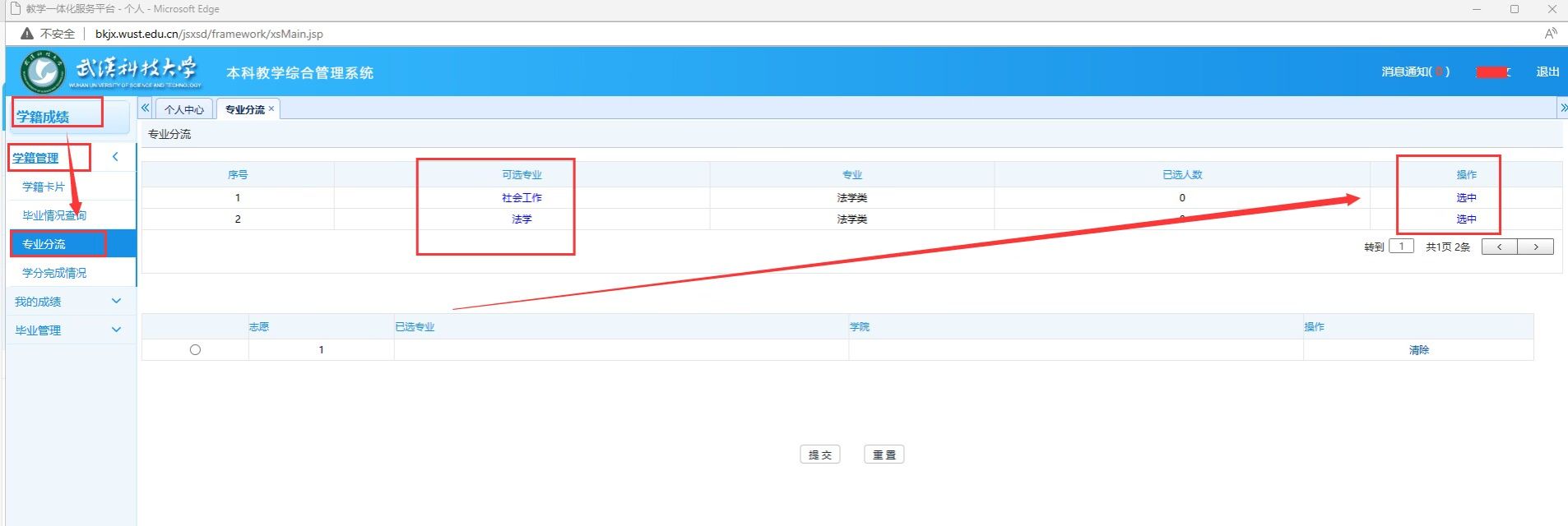 1、进入学籍成绩--学籍管理--专业分流,就可以看见能够选择的专业,最右边有选中按钮。
